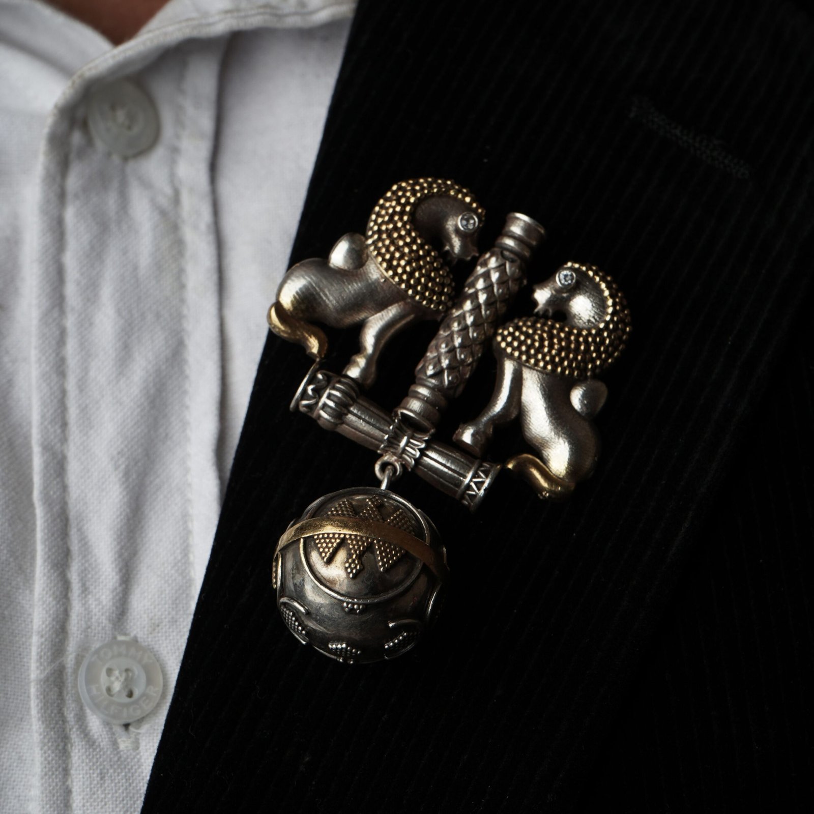 A royal twin-lion brooch crafted in silver with antique gold accents.
