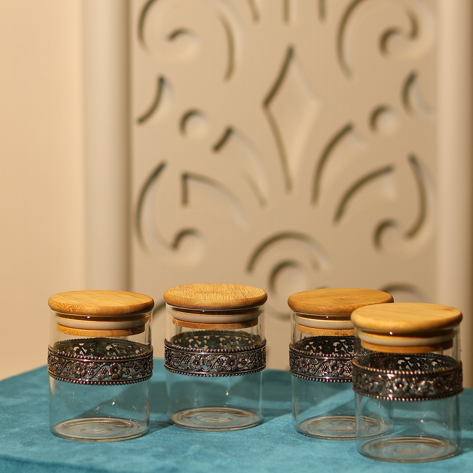 Elegant glass jar featuring a pure silver floral band and a smooth wooden lid.