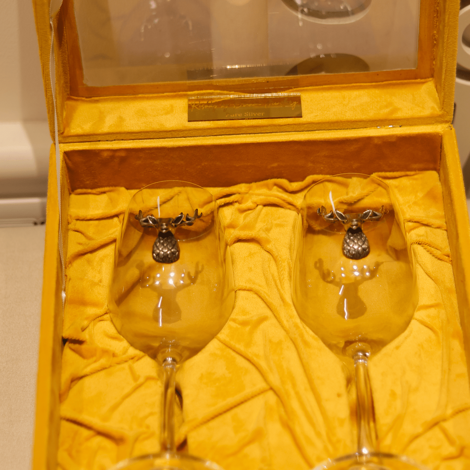 Elegant wine glasses with a regal pure silver deer motif, perfect for collectors and gifting.